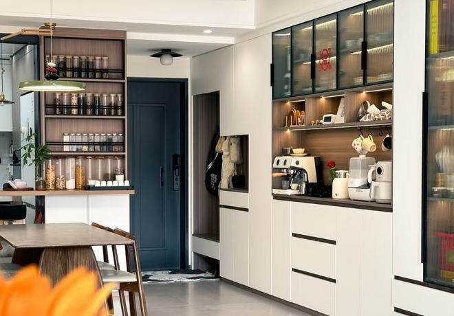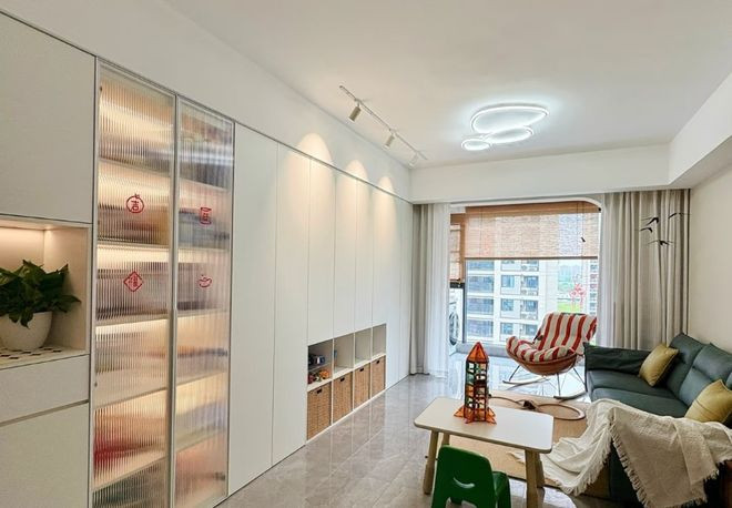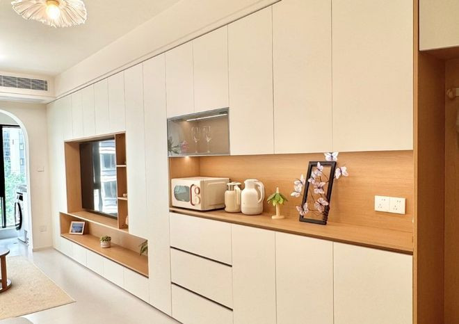 系统收纳墙,也让家变得隐形,有秩序。所有杂乱被关在统一的柜子里,呈现给外界的是简洁的线条,高级感就油然而生了。
