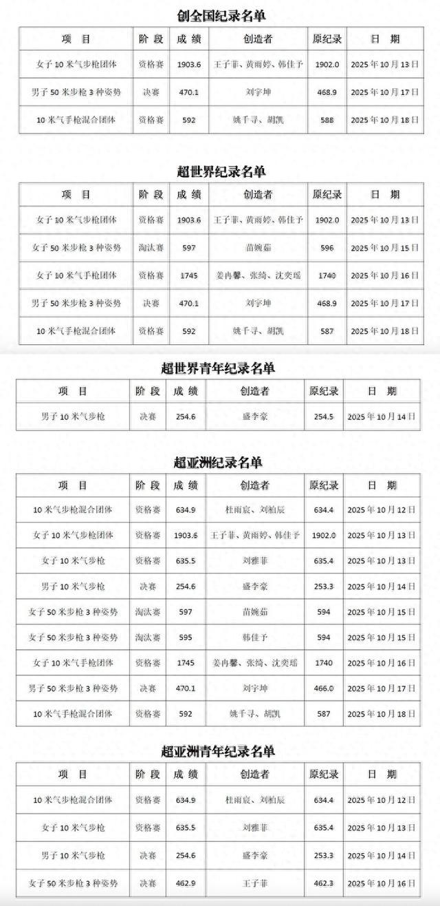 以上5个项目中,女子10米气步枪团体、男子50米步枪三姿决赛和10米气手枪混合团体刷新了全国纪录。