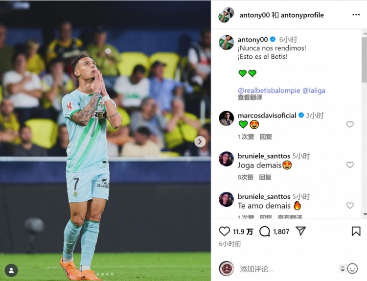 安东尼社媒晒出庆祝进球的照片,配文:“我们永不言弃,这就是贝蒂斯!”